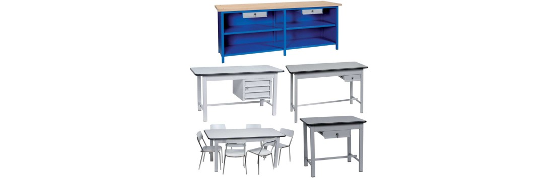 Tavolo da laboratorio professionale con struttura metallica in tubolare 60 x 40 e piano in laminato colore grigio chiaro oppure su richiesta colore tek con spessore 27 mm e bordi arrotondati in ABS nero e dotato di crociera inferiore poggia piedi e cassetto scorrevolea, portautensili ed oggetti, su cuscinetti a sfera, con altezza utile mm.70.