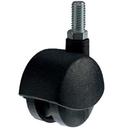 Rotelle per mobilia con nucleo e supporto rotante, serie confort in materiale polimero termoplastico nero con attacco a codolo/perno filettato.