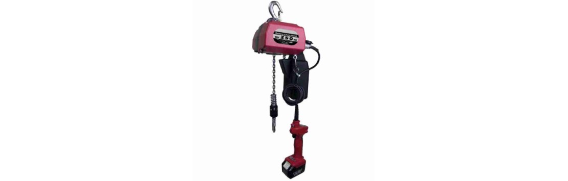 Paranco elettrico portatile a batteria da 18V. comprensivo di m.3 di catena ad 1 tiro per il sollevamento di carichi con un peso massimo di kg.250 e con m.3 di cavo pulsantiera inclusa ed un comodo ed utile kit valigetta per il trasporto in ambienti da lavoro o per sollevare attrezzature sportive, legname, bricolage e giardinaggio, per il fai da te e moltissime altre attività in aziende, fabbriche, industrie, laboratori, cantieri, hobbistica ed eventi.