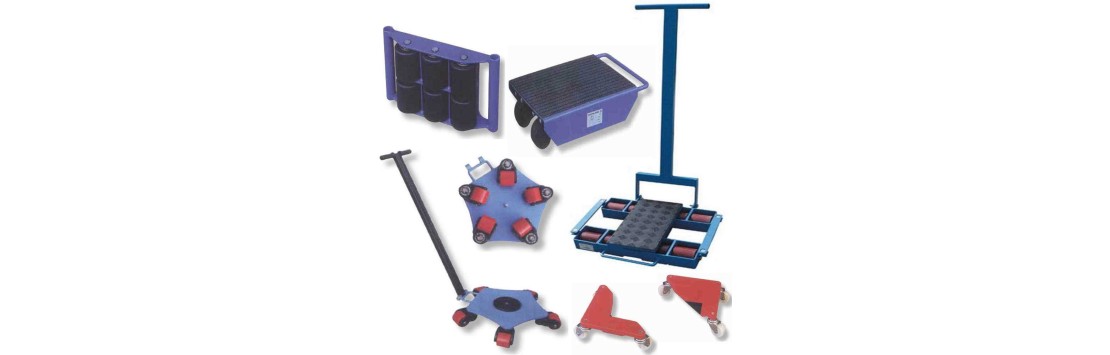 Guida sterzante con pattini manuali a 4 rulli con portata t.4 con ruote in poliuretano per maggiore resistenza e movimentazione, con piastra girevole su cuscinetti a sfere con timone per trasporto e spostamento industriale, regolare di carichi pesanti, rigidi, voluminosi senza rischi, come macchine utensili, presse, quadri elettrici, carpenterie, prefabbricati, stampi, mobili ed un vasto campo di altre applicazioni su un pavimento piano, liscio e resistente.