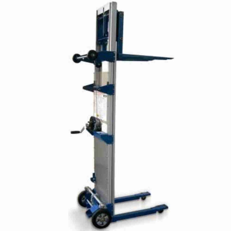 Sollevatore manuale portatile in lega di alluminio smontabile, compatto, resistente e leggero, realizzato con forche misura mm.630x570 con una struttura stabile su ruote e rulli in poliuretano, per facili spostamenti, utilizzabile in cantiere, in azienda per posizionamento prodotti e materiali su scaffalature e nei magazzini per ogni esigenza di sollevamento in ogni settore.