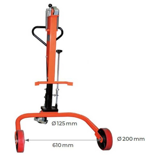 Sollevatore manuale portatile in alluminio smontabile, compatto e leggero, forche mm.630x570 su ruote e rulli in poliuretano, per spostamento merci in cantiere ed azienda.