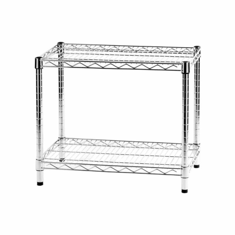 Scaffale componibile per interni Archimede cm.35x60xh.50 a due ripiani con portata Kg.100 in filo d’acciaio cromato, completo di guancette per il fissaggio dei piani all'altezza desiderata in corrispondenza delle apposite scanalature presenti sui tubolari ogni 2,5cm.
