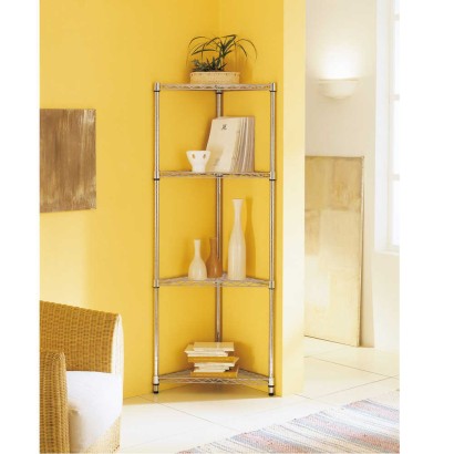 La linea dei ripiani in metallo cromato reticolare, molto robusta, del sistema Americano di scaffali componibili Archimede è fornita di 4 guancette di fissaggio Archimede system.