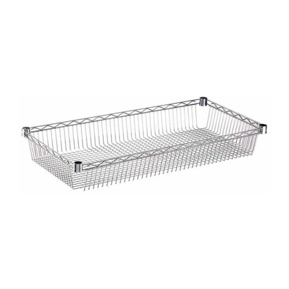 Piano, cesta contenitore in metallo cromato, adatto a molteplici esigenze, fornito di 4 guancette di fissaggio Archimede system art.ABCLIPF, per essere posizionato e regolato all’altezza desiderata in corrispondenza delle apposite scanalature presenti sui tubolari montanti ogni 2,5 cm.