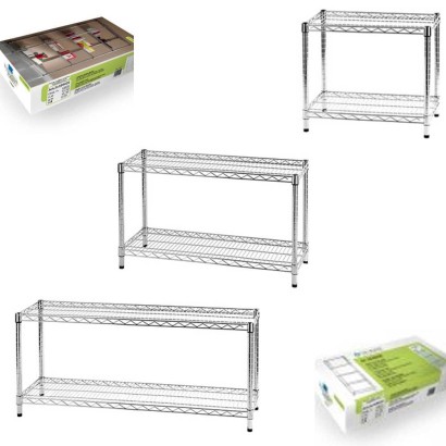 Scaffale componibile per interni Archimede cm.35x90xh.50 a due ripiani con portata Kg.100 in filo d’acciaio cromato, completo di guancette per il fissaggio dei piani all'altezza desiderata in corrispondenza delle apposite scanalature presenti sui tubolari ogni 2,5cm.