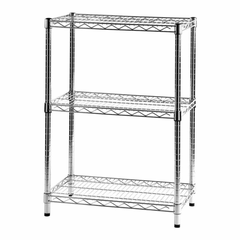 Scaffale componibile per interni Archimede cm.35x60xh.90 a tre ripiani con portata Kg.100 in filo d’acciaio cromato, completo di guancette per il fissaggio dei piani all'altezza desiderata in corrispondenza delle apposite scanalature presenti sui tubolari ogni 2,5cm.