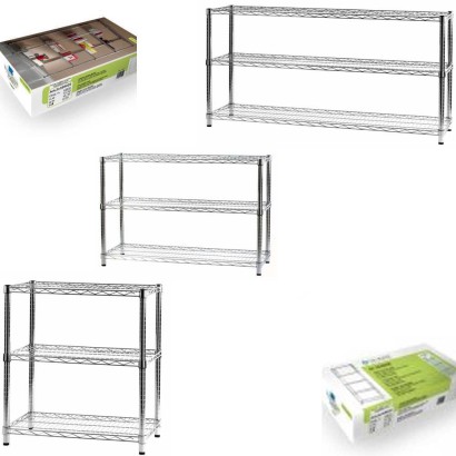 Scaffale componibile per interni Archimede cm.35x120xh.90 a tre ripiani con portata Kg.100 in filo d’acciaio cromato, completo di guancette per il fissaggio dei piani all'altezza desiderata in corrispondenza delle apposite scanalature presenti sui tubolari ogni 2,5cm.