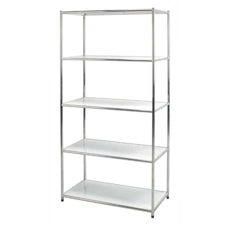 Libreria, banco, espositore cromato a 5 piani bianchi per salotti, cucine, uffici, studi, negozi comunità, alberghi, show-room, vetrine, ristoranti, con la possibilità per tutti i modelli, di aggiungere schienale e fianchi bianchi o di colore marrone per completate l'arredo della casa o dell'ufficio.