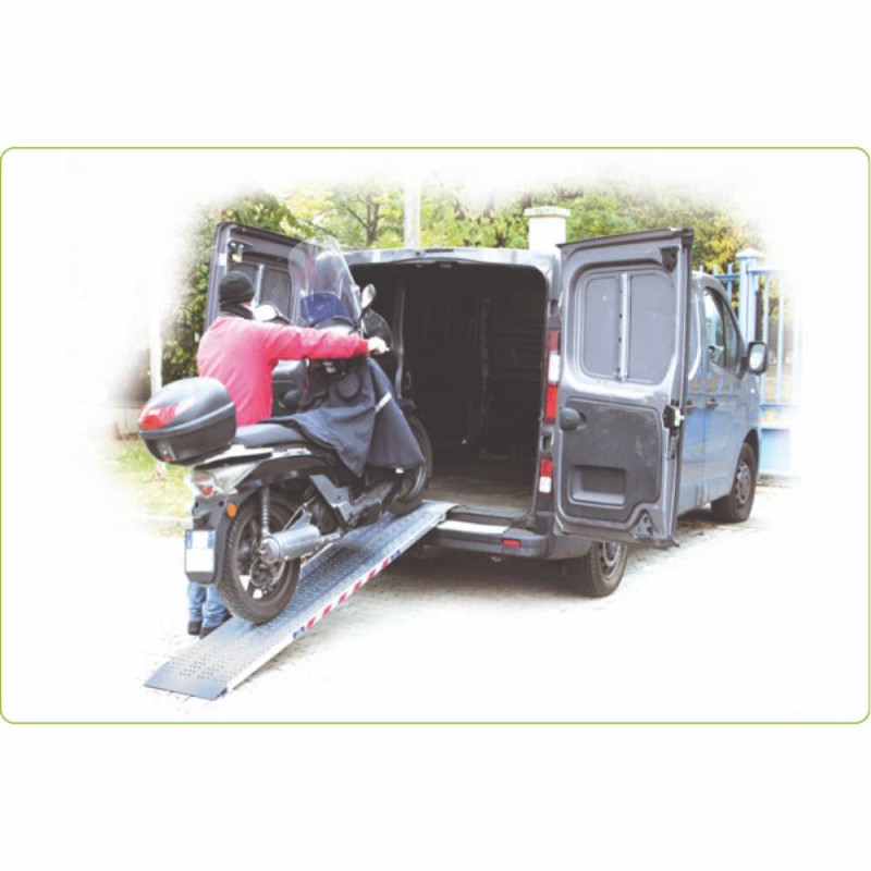 Rampa di carico per auto, moto, furgoni, mini escavatori, robusta in lega d'alluminio, completa di alette di fissaggio a sponda.