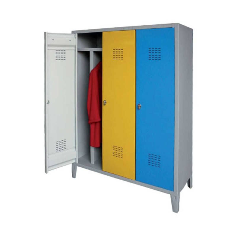 Armadietto in lamiera d'acciaio 7/10 di alta qualità ad 3 posti, resistente e destinato a durare nel tempo, ideato per spogliatoi efficienti e di stile, utile all'interno di aziende ed uffici.