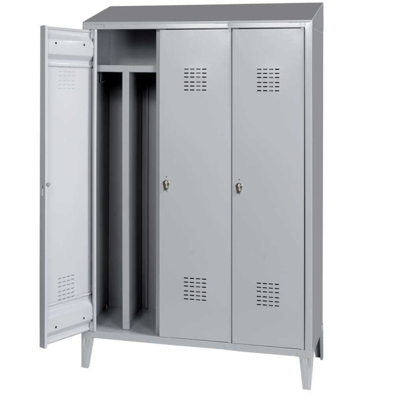 Armadio spogliatoio metallico tipo sporco pulito per alimentaristi, a norma legge 626, monoblocco ad 3 ante battente mm.1175x470xh.1800 con pianetto superiore con ganci e tubo porta grucce, ante con fori di areazione, chiusura maniglia lucchettabile oppure con serratura e tetto piano oppure inclinato (h.1930).