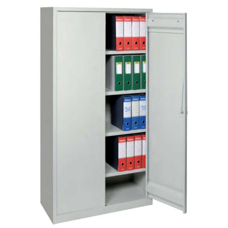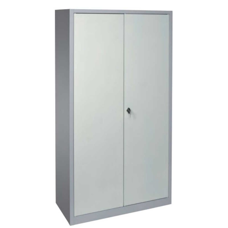 Armadio metallico da interno a due ante a battenti, utile come portadocumenti, porta faldoni per arredo uffici, aziende e come porta utensili per fabbriche di ogni genere e necessità, costruito nella versione monoblocco, in lamiera d'acciaio 8/10, verniciato con polveri epossidiche bucciato, fissate con cottura a 180° nel colore grigio RAL 7004 di serie ed a richiesta, con leggero sovraprezzo, eseguiamo anche diverse colorazioni come il Verde RAL 6011, blu RAL 5017.