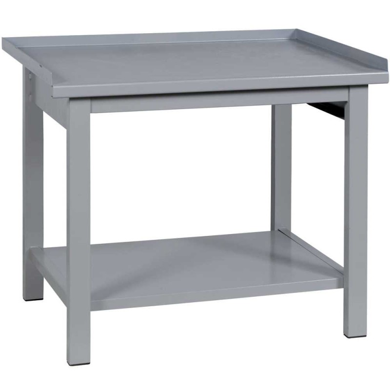 Banco da lavoro professionale in robusto acciaio verniciato smontabile, con piano superiore e inferiore in lamiera rinforzata e bordo su 3 lati e con piedi fissi per l'arredamento industriale in aziende, officine meccaniche, magazzini, laboratori, cantieri e garage per adoperare utensili, attrezzature e strumenti durante l'attività lavorativa ed organizzare al meglio la postazione di lavoro.