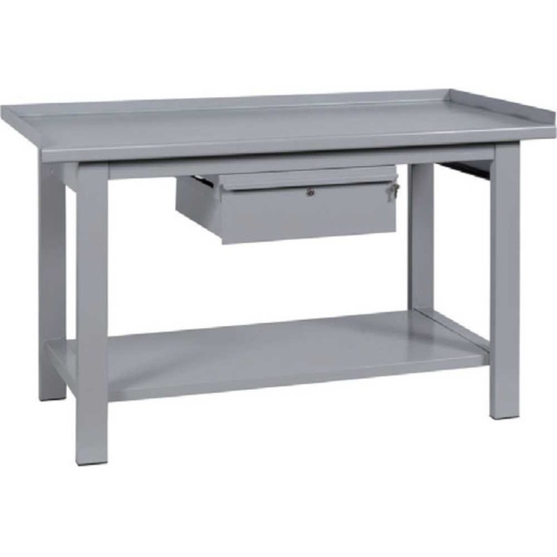 Banco da lavoro professionale in robusto acciaio verniciato smontabile, con piano superiore e inferiore in lamiera rinforzata e bordo su 3 lati, 1 cassetto scorrevole su cuscinetti a sfera e piedi fissi, per l'arredamento industriale in aziende, officine meccaniche, magazzini, laboratori, cantieri e garage per adoperare utensili, attrezzature e strumenti durante l'attività lavorativa ed organizzare al meglio la postazione di lavoro.