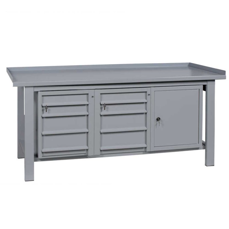 Banco da lavoro professionale in robusto acciaio verniciato smontabile, con piano superiore e inferiore in lamiera rinforzata e bordo su 3 lati, con 2 cassettiere a 4 cassetti scorrevoli su cuscinetti a sfera ed 1 armadietto, per l'arredamento industriale in aziende, officine meccaniche, magazzini, laboratori, cantieri e garage per adoperare utensili, attrezzature e strumenti durante l'attività lavorativa ed organizzare al meglio la postazione di lavoro.