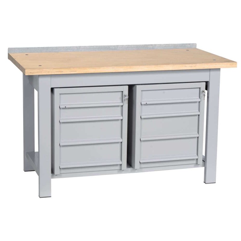 Bancone da lavoro robusto, con piano in legno, fornito monoblocco o smontato, accuratamente costruito, con lunghezza da mm.1000 a 3000, profondità mm.750 ed altezza mm.900, realizzato con struttura in tubolare sezione mm.60x40 e 80x40, pianale superiore in faggio multistrato spessore 40 mm., piano inferiore lamiera 10/10 con rinforzi, fasce superiori di collegamento lamiera spess. 15/10 e colore struttura in grigio RAL7004, ed a richiesta con sovraprezzo, disponibile in altri colori. Tutti i cassetti eventualmente presenti, scorrono su guide semplici con cuscinetti a sfera in metallo e sono completi di serrature.