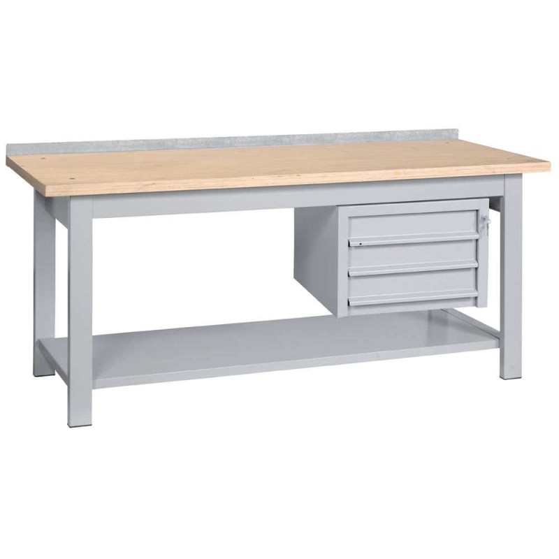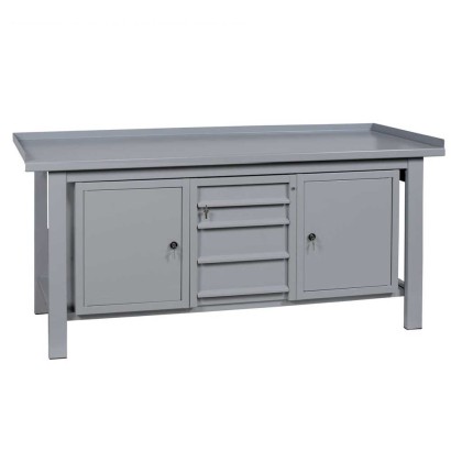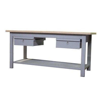 Bancone da lavoro robusto, con piano in legno, fornito monoblocco o smontato, accuratamente costruito, con lunghezza da mm.1000 a 3000, profondità mm.750 ed altezza mm.900, realizzato con struttura in tubolare sezione mm.60x40 e 80x40, pianale superiore in faggio multistrato spessore 40 mm., piano inferiore lamiera 10/10 con rinforzi, fasce superiori di collegamento lamiera spess. 15/10 e colore struttura in grigio RAL7004, ed a richiesta con sovraprezzo, disponibile in altri colori. Tutti i cassetti eventualmente presenti, scorrono su guide semplici con cuscinetti a sfera in metallo e sono completi di serrature.