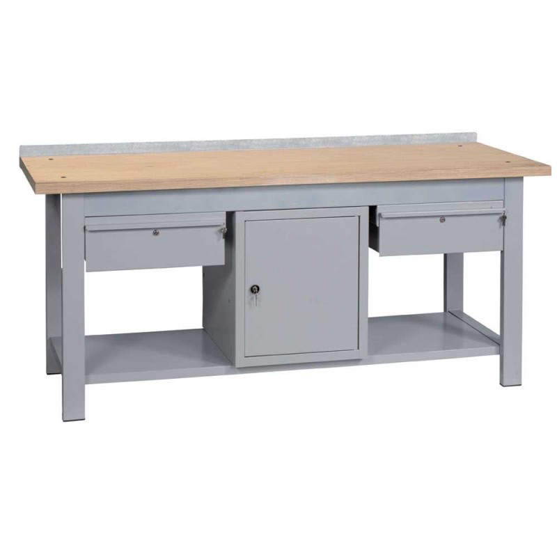 Banco da lavoro in metallo piano superiore legno multistrato cm200x75x90h 2 cassetti 1 armadietto arredo officine B720002C+1ARMF