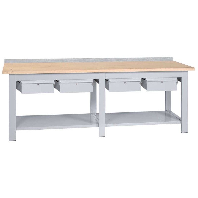 Tavolo da laboratorio professionale con struttura metallica in tubolare 60 x 40 e piano in laminato colore grigio chiaro oppure su richiesta colore tek con spessore 27 mm e bordi arrotondati in ABS nero e dotato di crociera inferiore poggia piedi e cassettiera a 3 cassetti, portautensili ed oggetti, su cuscinetti a sfera, con altezza utile mm.70.