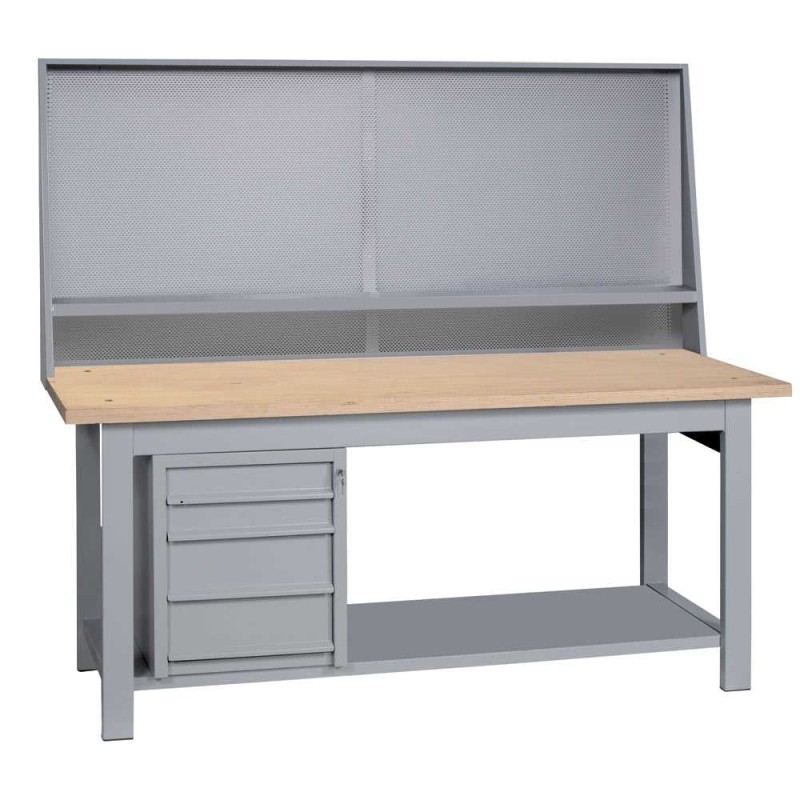 Bancone da lavoro robusto, con piano in legno, fornito monoblocco o smontato, accuratamente costruito, con lunghezza da mm.1000 a 3000, profondità mm.750 ed altezza mm.900, realizzato con struttura in tubolare sezione mm.60x40 e 80x40, pianale superiore in faggio multistrato spessore 40 mm., piano inferiore lamiera 10/10 con rinforzi, fasce superiori di collegamento lamiera spess. 15/10 e colore struttura in grigio RAL7004, ed a richiesta con sovraprezzo, disponibile in altri colori. Tutti i cassetti eventualmente presenti, scorrono su guide semplici con cuscinetti a sfera in metallo e sono completi di serrature.