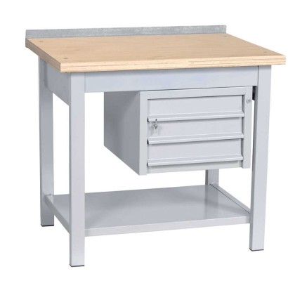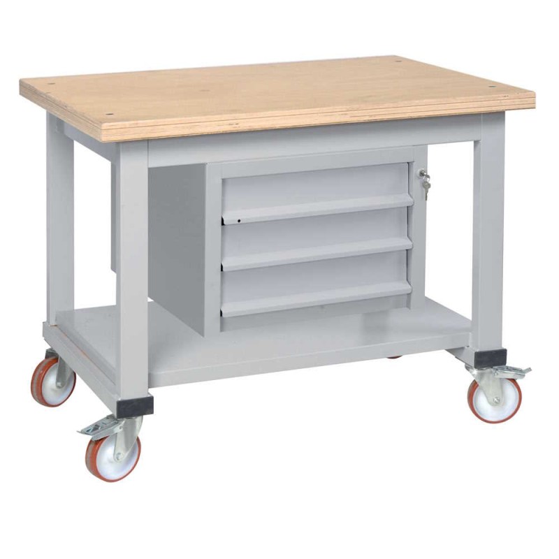 Banco da lavoro su 4 ruote con cassettiera a 3 cassetti scorrevoli su cuscinetti a sfera e chiusura con serratura ideale per contenere piccole attrezzature e strumenti da lavoro ed accessori per ufficio.