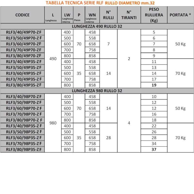 Rulli: Ø mm.32 con testate a ricolo di sfere lubrificate, tubo zincato, asse a molla Ø mm.8, sporgenza del rullo dalla rulliera mm.2, spessore tubo mm.1,2