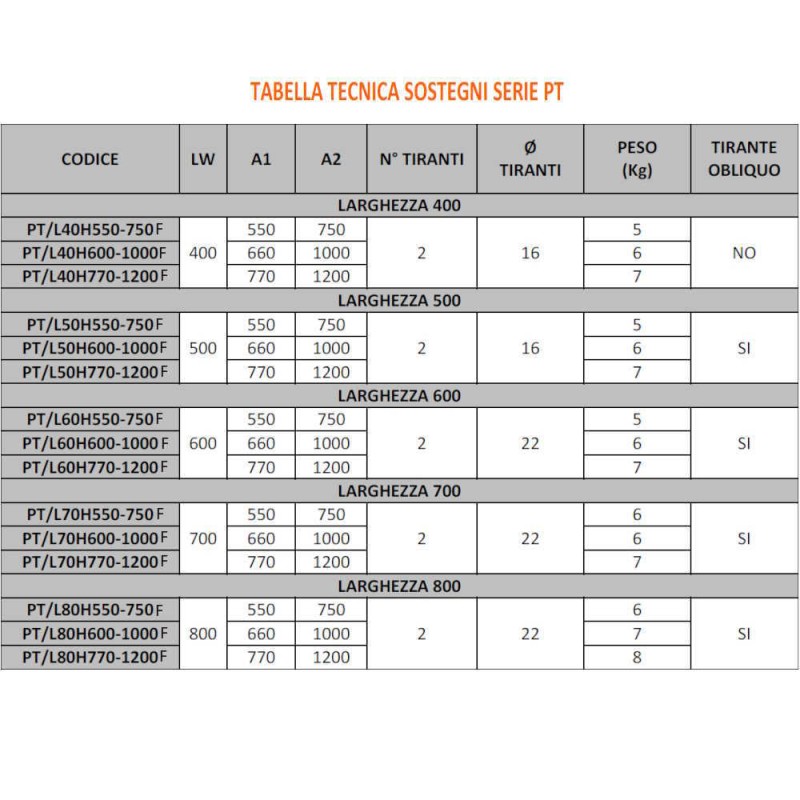 Piedi telescopici di larghezze standard (LW) di: 400-500-600-700-800.