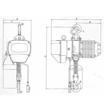 Paranco elettrico composto da un gancio di sospensione solido e robusto con linguetta di sicurezza e da un sistema di carrucole a cui viene trasmesso il movimento tramite l'assistente di catene.