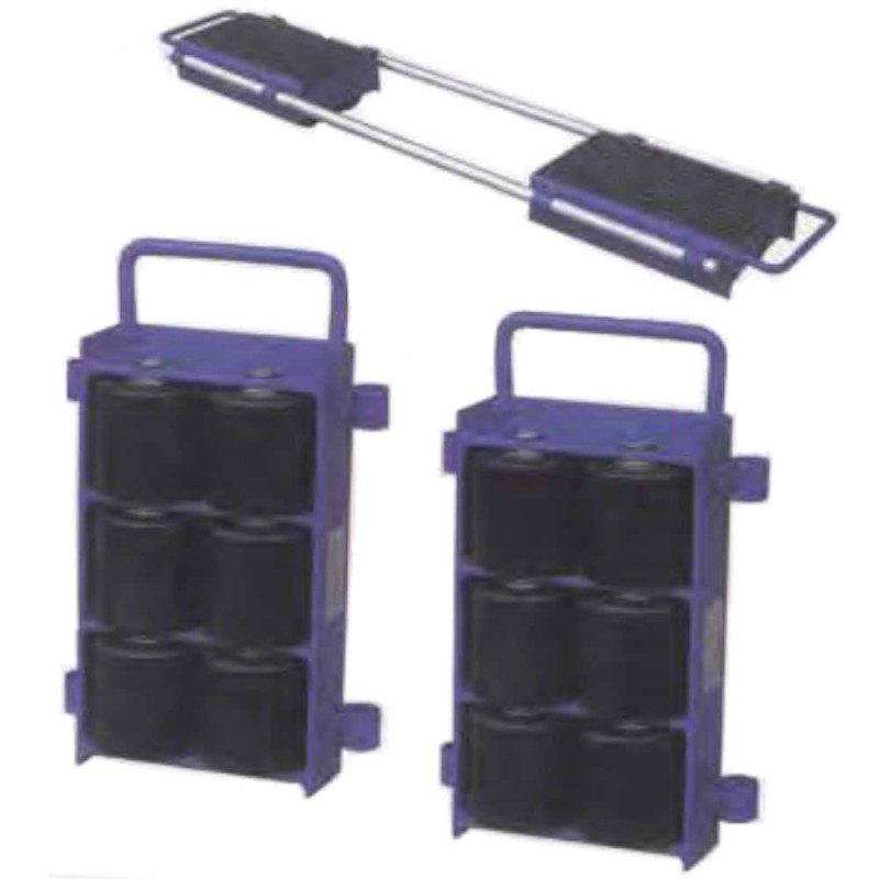 Kit 2 Pattini a 6 ruote fisse in nylon cadauno, per un totale di 12 rulli su entrambi i pattini con portata totale di Kg.12000 progettati per lavorare insieme, collegati da due barre laterali regolabili in lunghezza, per la movimentazione industriale in sicurezza di carichi più o meno pesanti, voluminosi e rigidi manualmente, su pavimentazioni piane e resistenti con la massima precisione ed il minimo sforzo da parte dell'operatore.