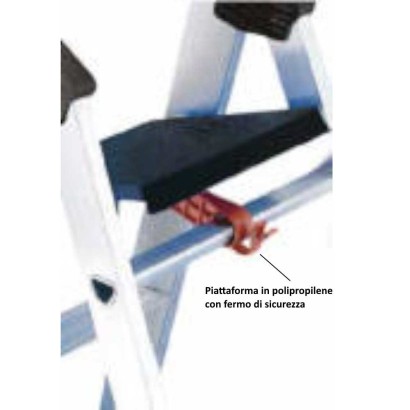 Scala in alluminio leggera, resistente e professionale, con portata massima Kg.150, con piattaforma in polipropilene con fermo di sicurezza e cinghia anti-apertura, ideata per essere molto pratica, compatta e salvaspazio con appoggio sicuro, per uso artigianale e domestico.
