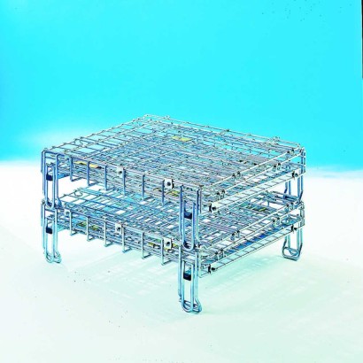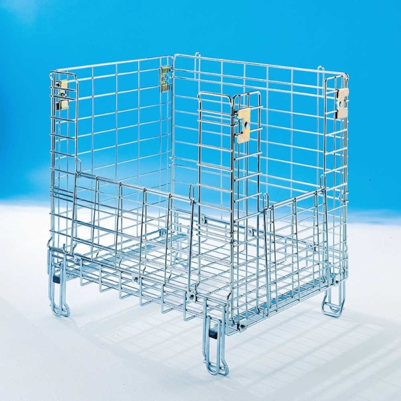 Contenitore con 4 ruote girevoli ad alta scorrevolezza e portata per una facile movimentazione nei magazzini, sovrapponibile, dotato di antello anteriore e di antello laterale apribile a ribalta che permettono di prelevare le merci da entrambi i lati e per facilitare le operazioni di carico e scarico merci, idoneo all'esposizione dei prodotti. La rete metallica consente una buona visibilità del prodotto, nei settori tessile, logistico e per lo stoccaggio dei prodotti ortofrutticoli e alimentari.