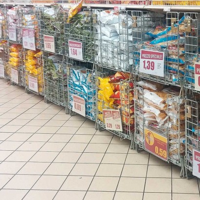 Cesta, gabbia metallica con ruote, studiata per occupare uno spazio ridotto, essere maneggevole e posizionabile al di sotto delle scaffalature da supermercato. Le sue dimensioni sono standardizzate per occupare metà pallet EUR, quindi si possono stoccare agevolmente all’interno dei camion. Questi contenitori sono sovrapponibili e si possono accatastare tra loro creando una sorta di scaffalatura modulare, inoltre, sono pieghevoli occupando uno spazio ridotto quando non sono in uso (sia in magazzino sia per il ritorno a vuoto su camion).