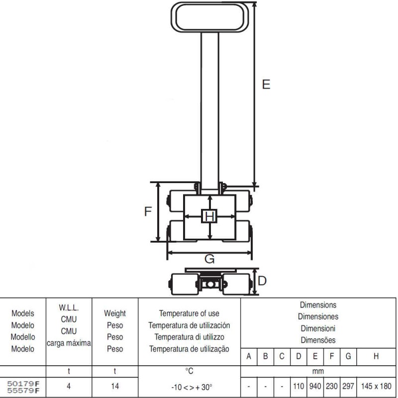 Guida sterzante con pattini a 4 rulli con portata t.4 con ruote in poliuretano con piastra girevole su cuscinetti e sfere completa di timone da mm.940 di lunghezza per la movimentazione industriale e per il trasporto facile e regolare di carichi pesanti su un pavimento piano e liscio (adatto su cemento e piastrelle, vietato su terreni senza rivestimenti come la terra battuta).