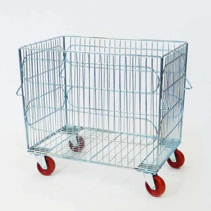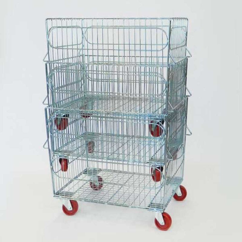 Cesto carrellato impilabile, incastrabile ed accatastabile, realizzato in filo metallico zincato elettroliticamente per trasporto biancheria in settori come lavanderie industriali, alberghi e negozi di abbigliamento.