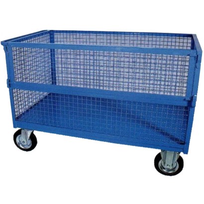 Carrello, cestone contenitore in ferro, con pianale rinforzato in lamiera liscia e quattro sponde in rete, di cui una laterale lunga parzialmente ribaltabile a metà, struttura molto robusta in ferro e quattro ruote in gomma dimensionate per un'elevata portata ed una buona manovrabilità, anche in spazi ristretti e con superfici non perfettamente piane, per trasportare prodotti sfusi, imballati, semilavorati o attrezzature varie secondo le esigenze.