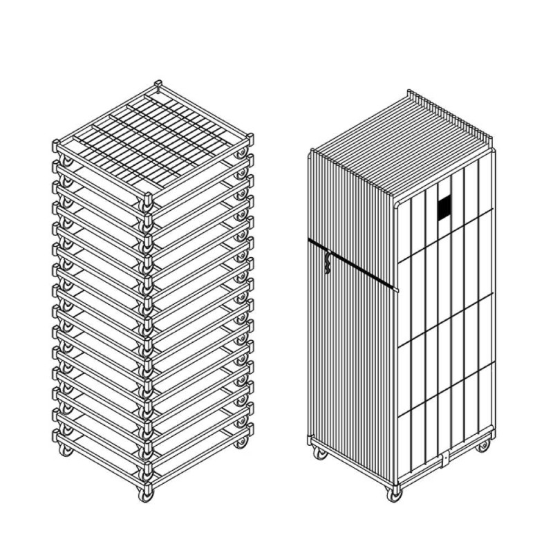 Carrello in acciaio da lavoro professionale con dimensioni unificate mm.715x805x1800h con rotelle 2 fisse e 2 girevoli, che permette di essere caricato sui camion affiancato a gruppi di 3 rollcontainers.
