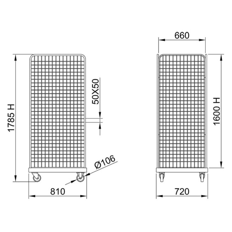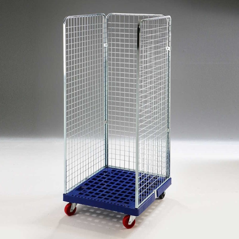 Roll container unificato con base in plastica per lavanderie industriali e con 3 pareti con misura mm.720x810x1800h, robuto con maglia in filo metallico mm.50x50, consigliato per movimentare, conservare, spostare e stoccare le merci, nella logistica, nell'esposizione prodotti nei supermercati, nelle lavanderie per biancheria e sacchi, in ospedali, nei magazzini, in enti pubblici, particolarmente silenzioso, leggero e facile da manovrare.