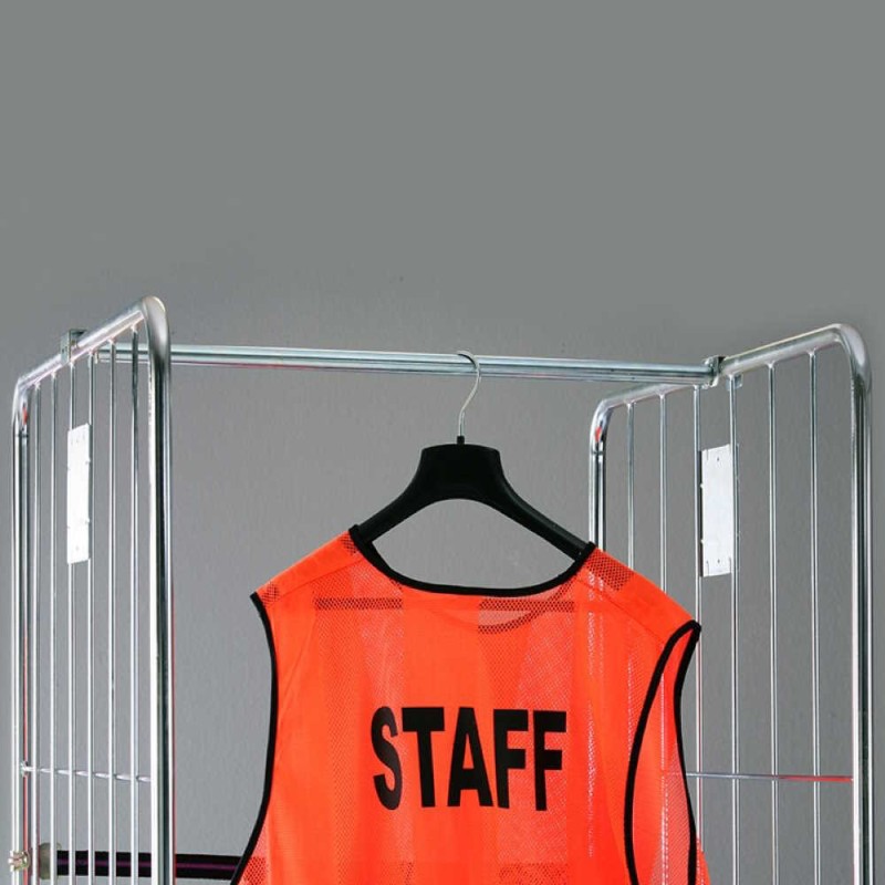 Barra appendiabiti per roll container standard unificato, accessorio adatto come barra per abiti e capi appesi a grucce, utilizzabile sui carrelli roll container per caricare, spostare, trasportare e scaricare i vestiti stoccati all'interno dei carrelli contenitori nel settore tessile, nelle lavanderie industriali, nei negozi di abbigliamento, nella movimentazione, nella logistica e su camion e furgoni o per la semplice esposizione delle merci nei supermercati.