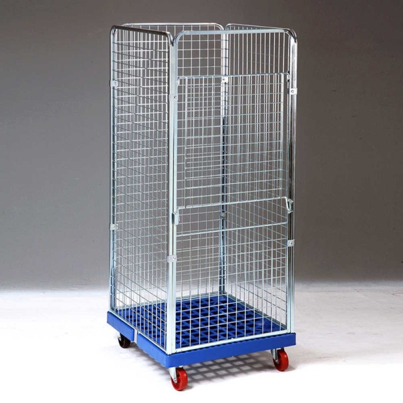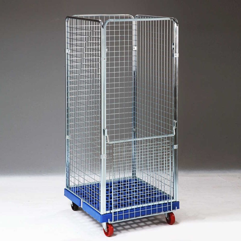 Roll container a 4 pareti per lavanderie industriali mm.720x810x1800h a maglia fitta in acciaio, con base in plastica su ruote con portata kg.300 e quarta parete con antello apribile è il carrello contenitore unificato ideale per il trasporto ed il ritiro di sacchi e della biancheria, grazie alla particolare maglia 50x50 non permette ai capi di fuoriuscire.