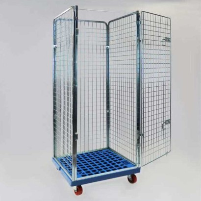Roll container con base in plastica su ruote portata Kg.300 per lavanderie industriali, dimensioni mm.720x810x1800h a 4 pareti con maglia mm.50x50, con quarta parete intera apribile a 270 gradi.