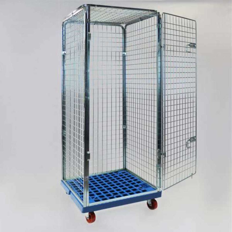 Roll container base plastica antifurto sicurezza 720x810x1800h maglia 50x50 è il carrello contenitore unificato ideale per il trasporto, lo stoccaggio ed il ritiro di merci di valore in centri commerciali, supermercati, poste, banche, comuni, scuole, negozi, magazzini, lavanderie.