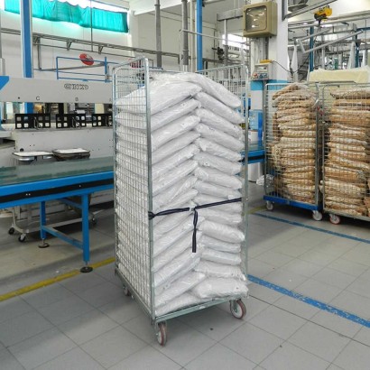 Roll container industriale realizzato con pareti in tubo quadro brevettato che, fissate alla base e tra loro tramite viti e dadi, costituiscono una struttura rigida e robusta e con una particolare maglia metallica mm.50x50 sulle sponde, che non permette ai capi di fuoriuscire.