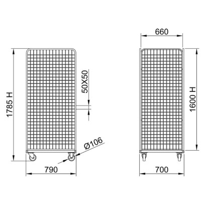 Roll container mm.700x800x1800h con 3 pareti a maglia mm.50x50 per lavanderia e per il trasporto ed il ritiro di sacchi e della biancheria in alberghi, comunità, ospedali.