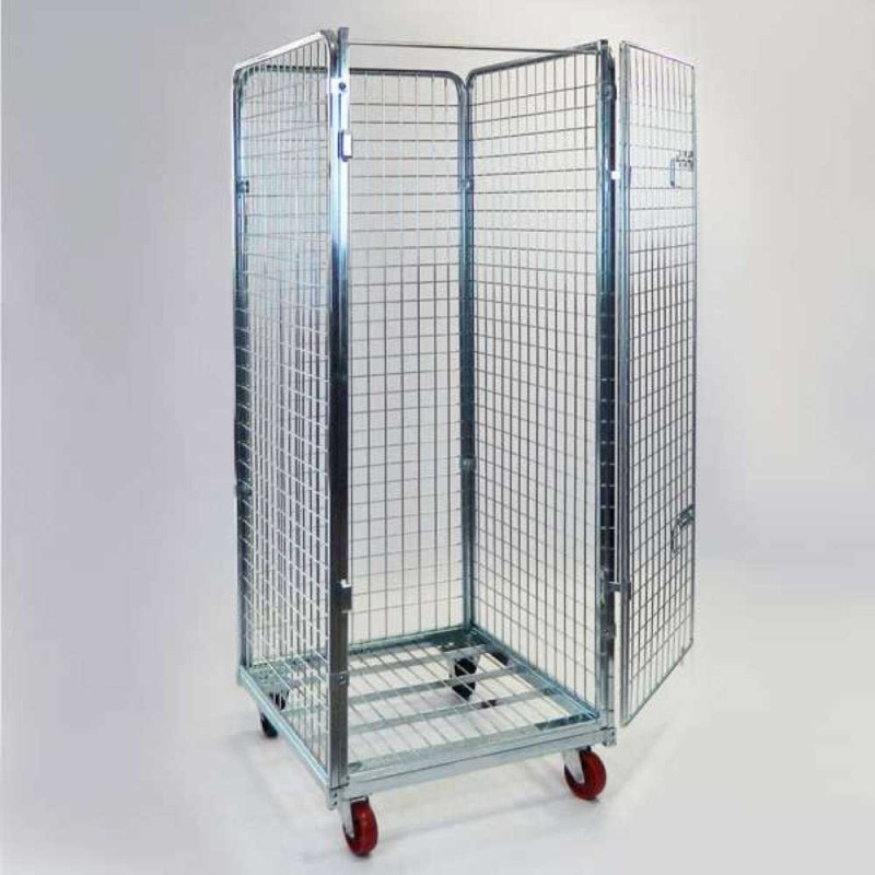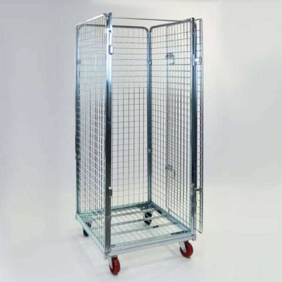 Roll container industriale realizzato con pareti in tubo quadro brevettato che, fissate alla base e tra loro tramite viti e dadi, costituiscono una struttura rigida e robusta e con una particolare maglia metallica mm.50x50 sulle sponde, che non permette ai capi di fuoriuscire.