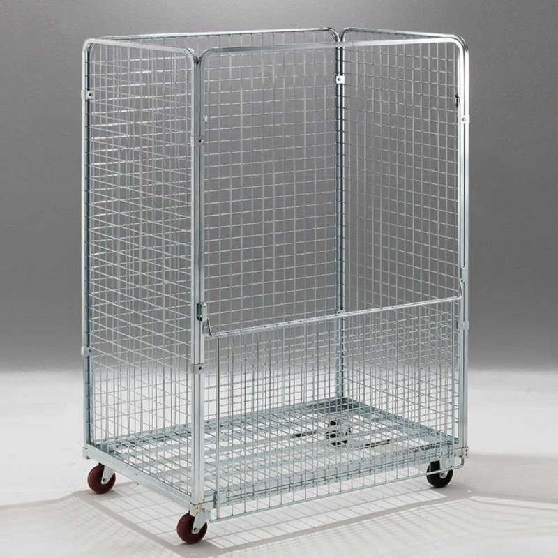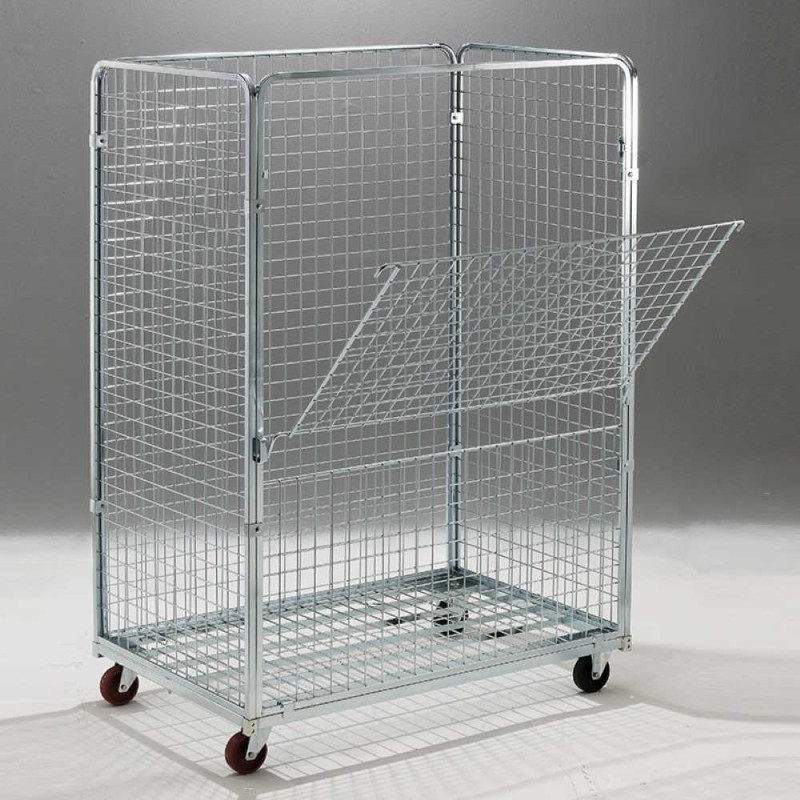 Roll container carrello scaffale con 4 pareti ed un antello a ribalta con maglia mm.50x50 con dimensioni mm.1200x800x1800h, per lavanderie industriali è ideale per il trasporto ed il ritiro di sacchi e della biancheria, grazie alla particolare maglia mm.50x50 che non permette ai capi di fuoriuscire e viene utilizzato anche per la raccolta differenziata dei rifiuti presso isole ecologiche (RAEE), portinerie, condomini, aziende.