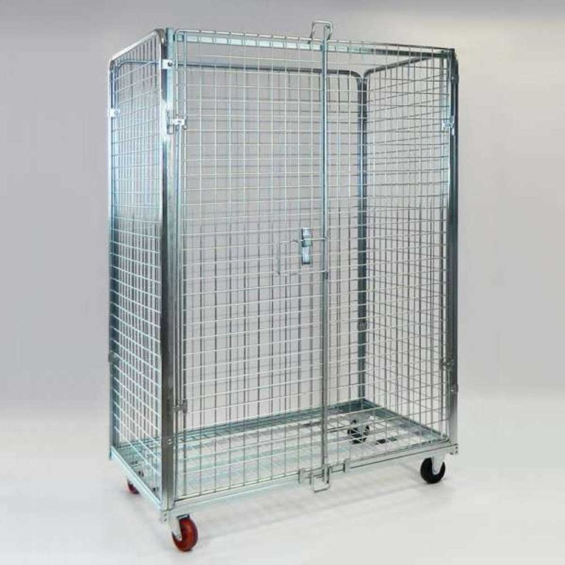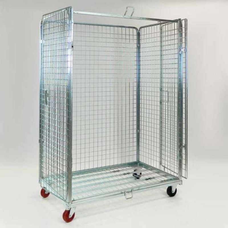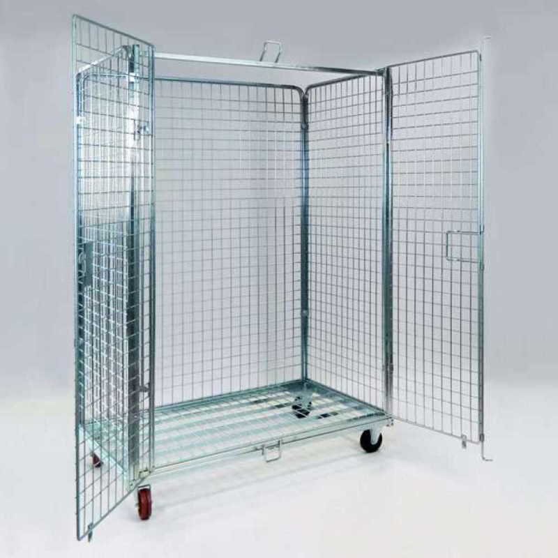 Roll container con IV parete costruita con robusto telaio fissato alla base e alle pareti laterali con doppia porta apribile fino a 270° e chiavistello di chiusura lucchettabile.