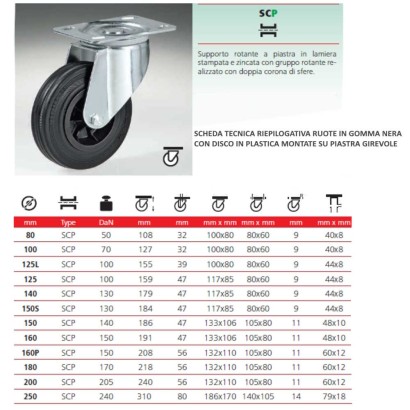 Ruota con piastra girevole costruita con struttura con anello esterno in gomma piena a profilo trapezoidale nero e con parte interna con nucleo portante in polimero termoplastico su staffa girevole, utilizzata per strutture, carichi e pesi di piccola portata, per merci su pavimentazione interna ed esterna in aziende, magazzini, cantine, uffici, supermercati, negozi, alberghi, bar mense, fabbriche, centri logistici, mercati.