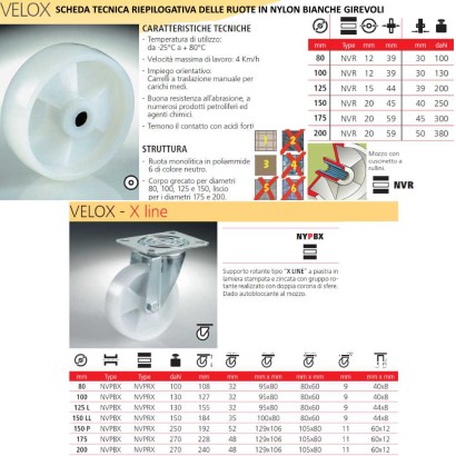 Ruota girevole in nylon bianco, antitraccia che non macchia al contatto, inodore, igienico, con una buona resistenza all'abrasione ed a numerosi prodotti petroliferi ed agenti chimici. Teme il contatto con acidi forti.
