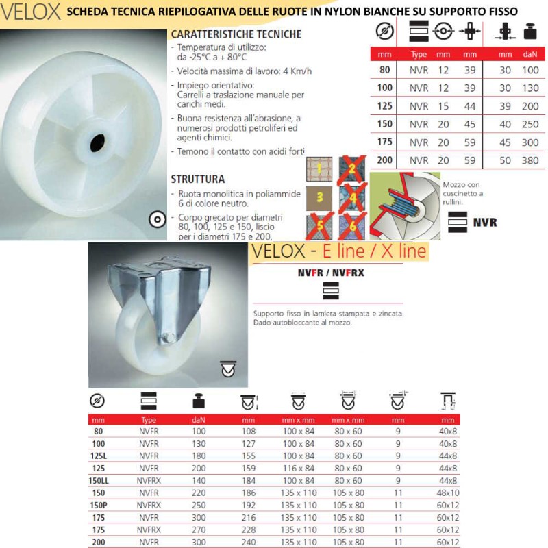 Ruota fissa in nylon bianco, antitraccia che non macchia al contatto, inodore, igienico, con una buona resistenza all'abrasione ed a numerosi prodotti petroliferi ed agenti chimici. Teme il contatto con acidi forti.